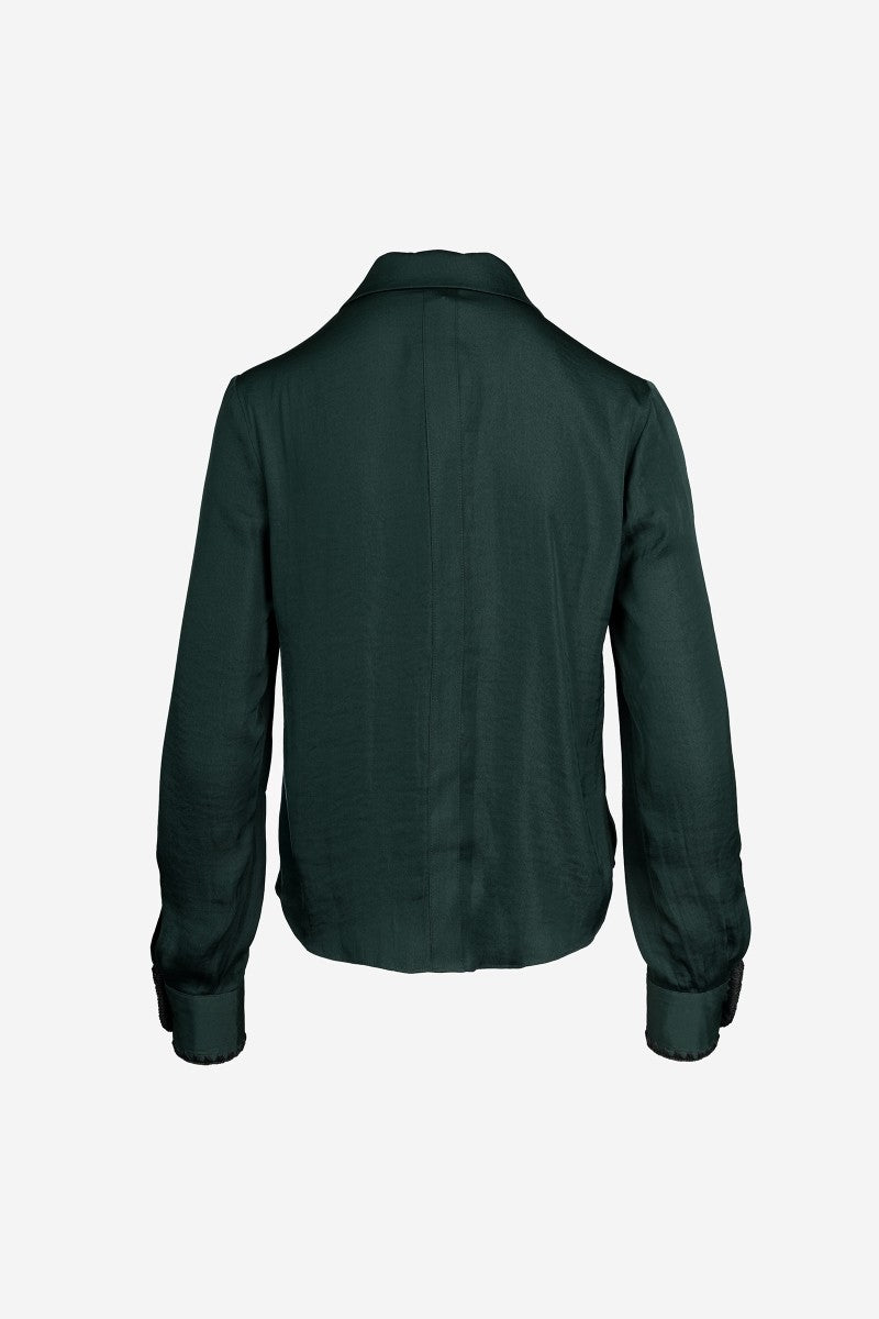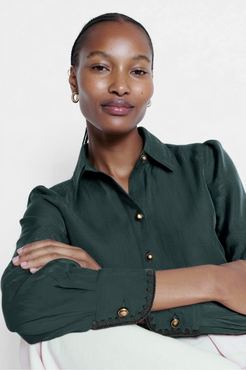 Elevate your everyday wardrobe with this sophisticated button-up blouse, designed for modern versatility. The smooth woven fabric drapes beautifully with a relaxed fit that flatters any frame, while distinctive blanket-stitch cuff detailing adds refined texture and visual interest. Antique gold buttons and a high-low cropped hem transform the classic silhouette into something uniquely polished. Style it half-tucked with tailored trousers for office elegance or wear it loose over denim for weekend ease—this piece effortlessly transitions between occasions with understated charm.