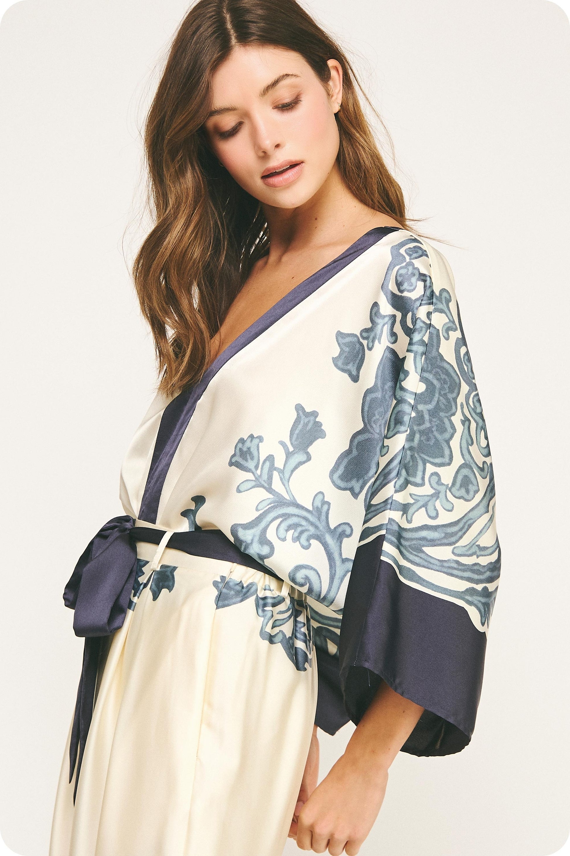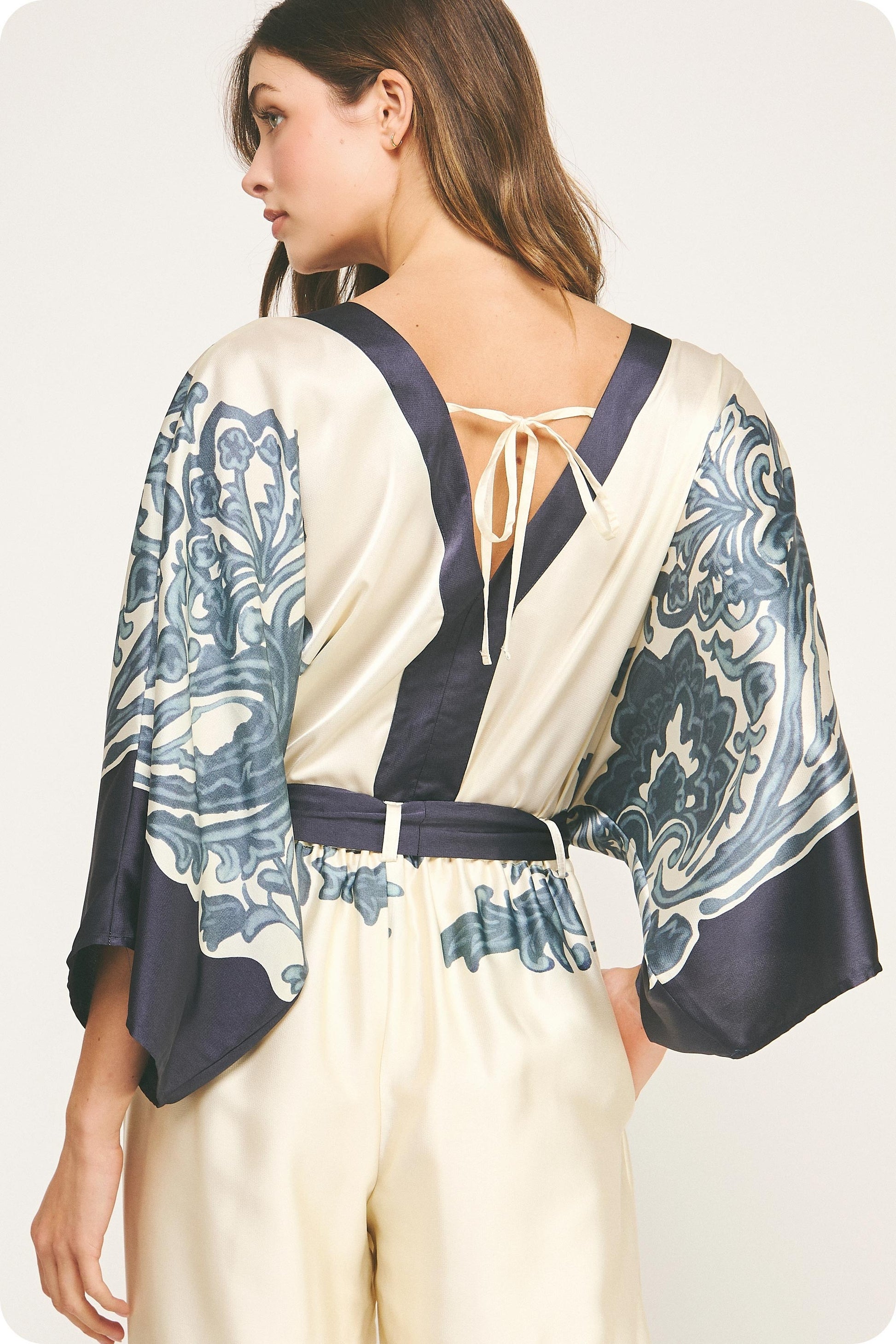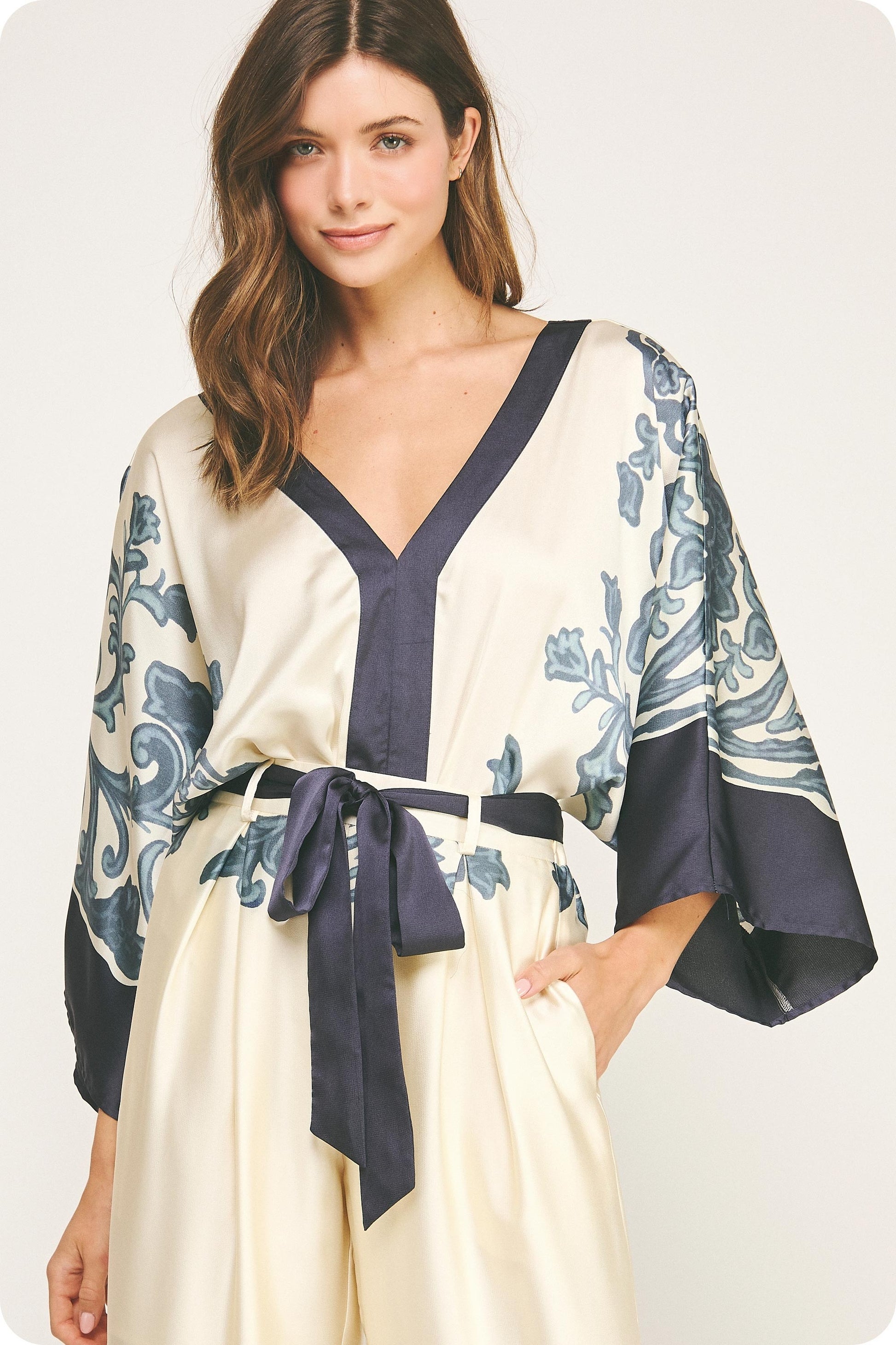 Elevate your wardrobe with this Border Print Satin Bodysuit, featuring a striking abstract paisley border design that adds artistic flair. Crafted from smooth satin, it offers a flattering V neckline highlighted by a contrasting panel. The dolman kimono sleeves provide effortless elegance and comfort, while the snap closure ensures a secure fit. Perfect for day-to-night wear, this bodysuit combines style and function for a confident, polished look.