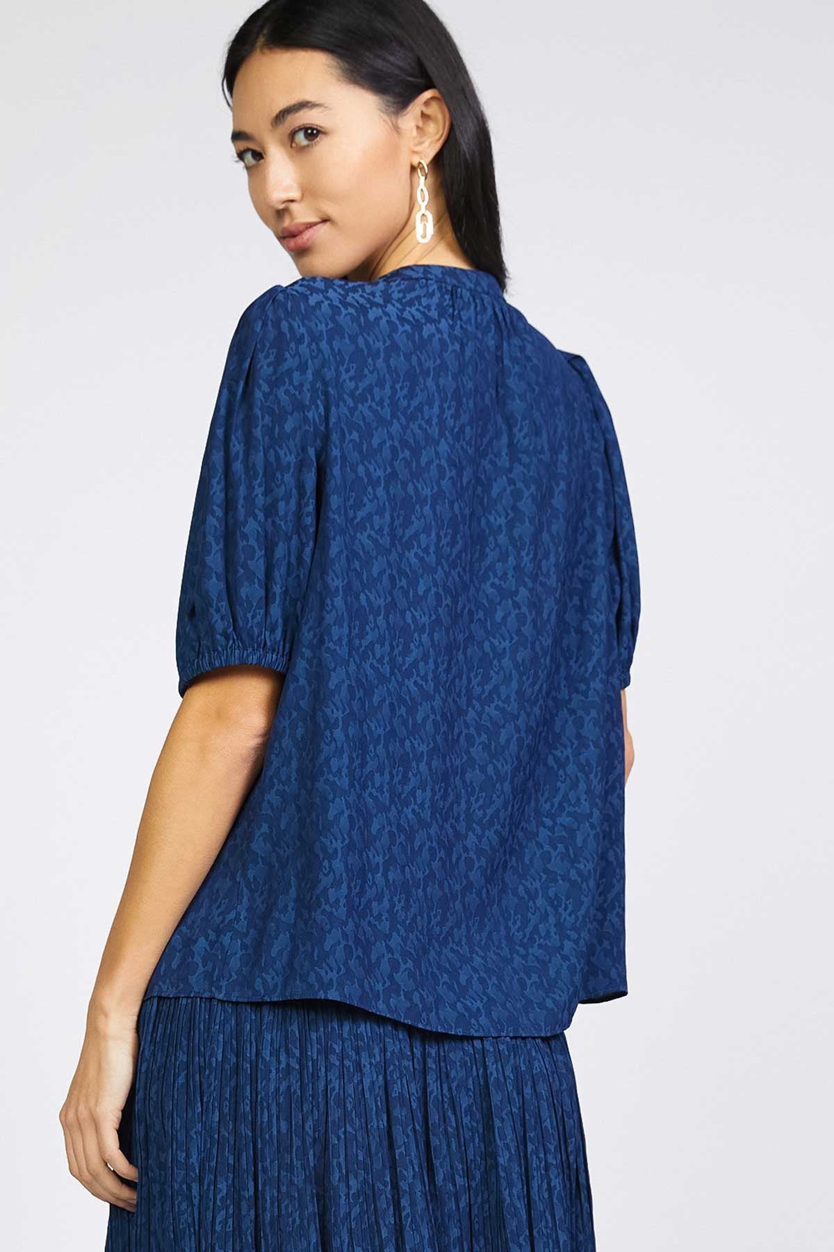 This short sleeve blouse blends style and sustainability with a soft camouflage jacquard print. Featuring a round neck and a front placket with covered button details, it offers a polished look perfect for any occasion. Crafted from 57% recycled polyester and 43% polyester, it provides comfort while supporting eco-friendly choices. Elevate your wardrobe with this versatile, thoughtful design.