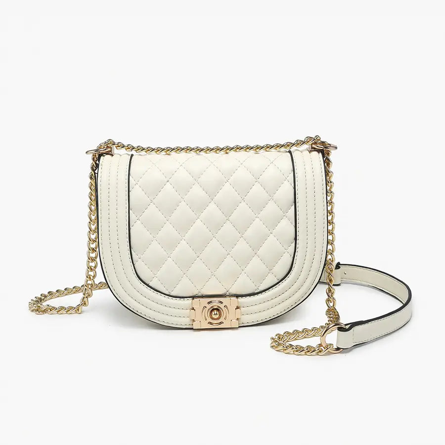 Elevate your style with the Diana Quilted Snap Front Crossbody. The timeless quilted pattern adds a touch of luxury, while the secure push-lock closure keeps your essentials safe. The adjustable chain strap allows for comfortable shoulder or crossbody wear. Its compact dimensions make it perfect for everyday use.