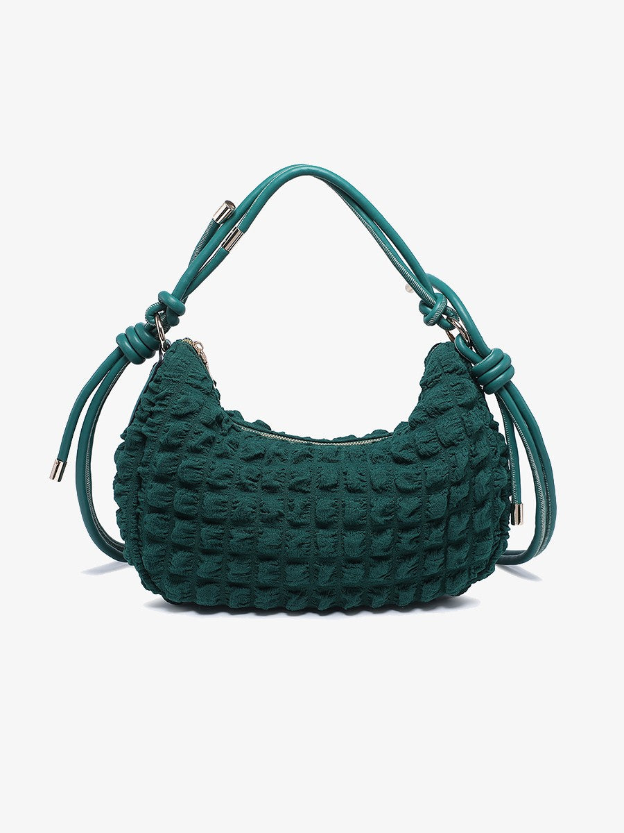 The Nelly Soft Quilted Crossbody is a stylish and functional accessory. Its puffy quilted design adds a soft and luxurious touch, making it a standout piece. The top zip closure ensures the security of your belongings, while the knotted crossbody strap and knotted handle with metal accent add a unique flair. This crossbody bag is spacious enough for everyday essentials and is perfect for adding a fashionable statement to your ensemble.