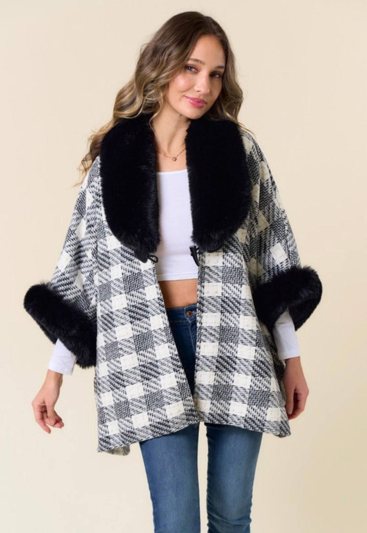 Plush Faux Fur Collar Plaid Print Shawl Cardigan OBJ2410-BLA-IVO
