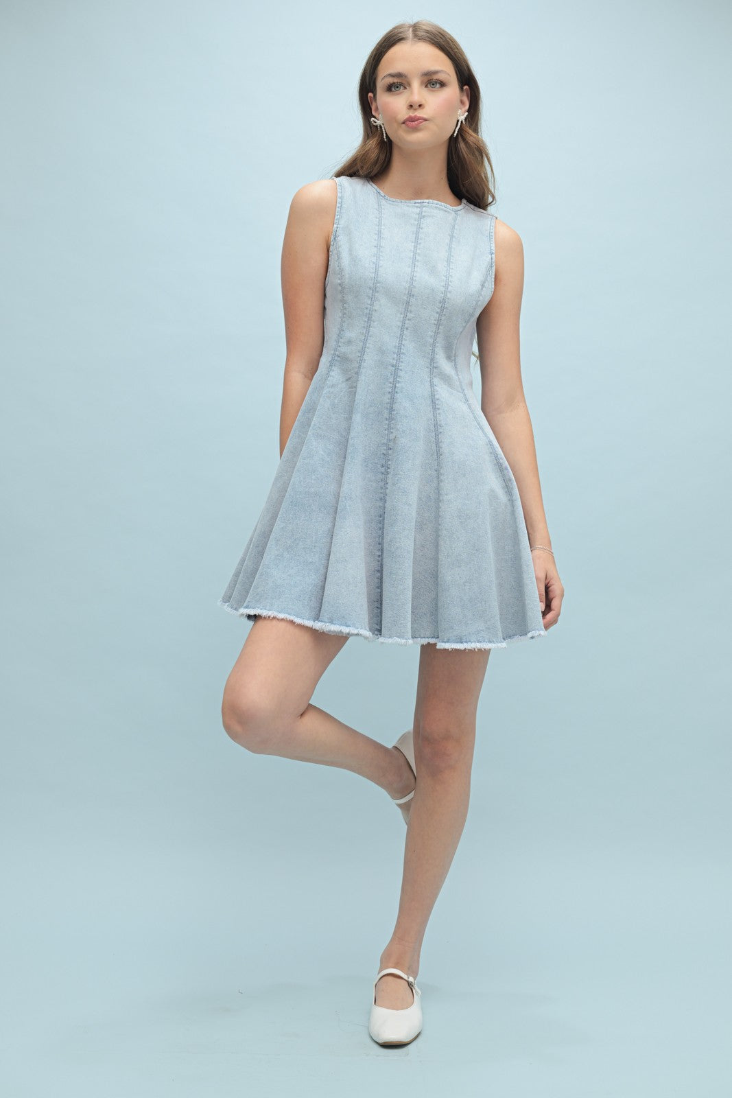 Elevate your wardrobe with the Stretch Denim Flared Mini Dress. Crafted from 98% cotton and 2% spandex, this dress offers a comfortable stretch fit that moves with you. The flared silhouette adds a playful touch, while the back zip closure ensures a seamless, flattering fit. Perfect for both casual outings and stylish gatherings, this dress combines comfort and trend effortlessly.