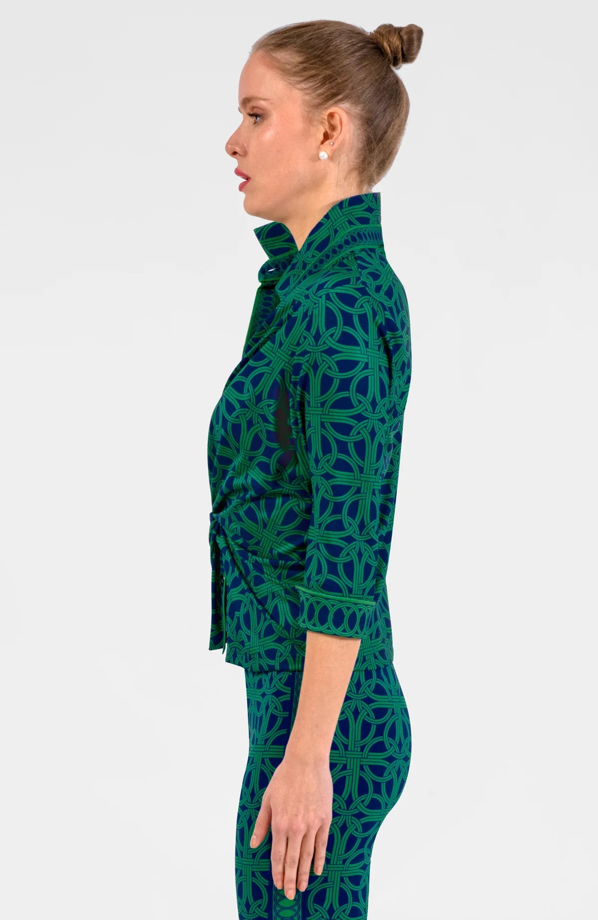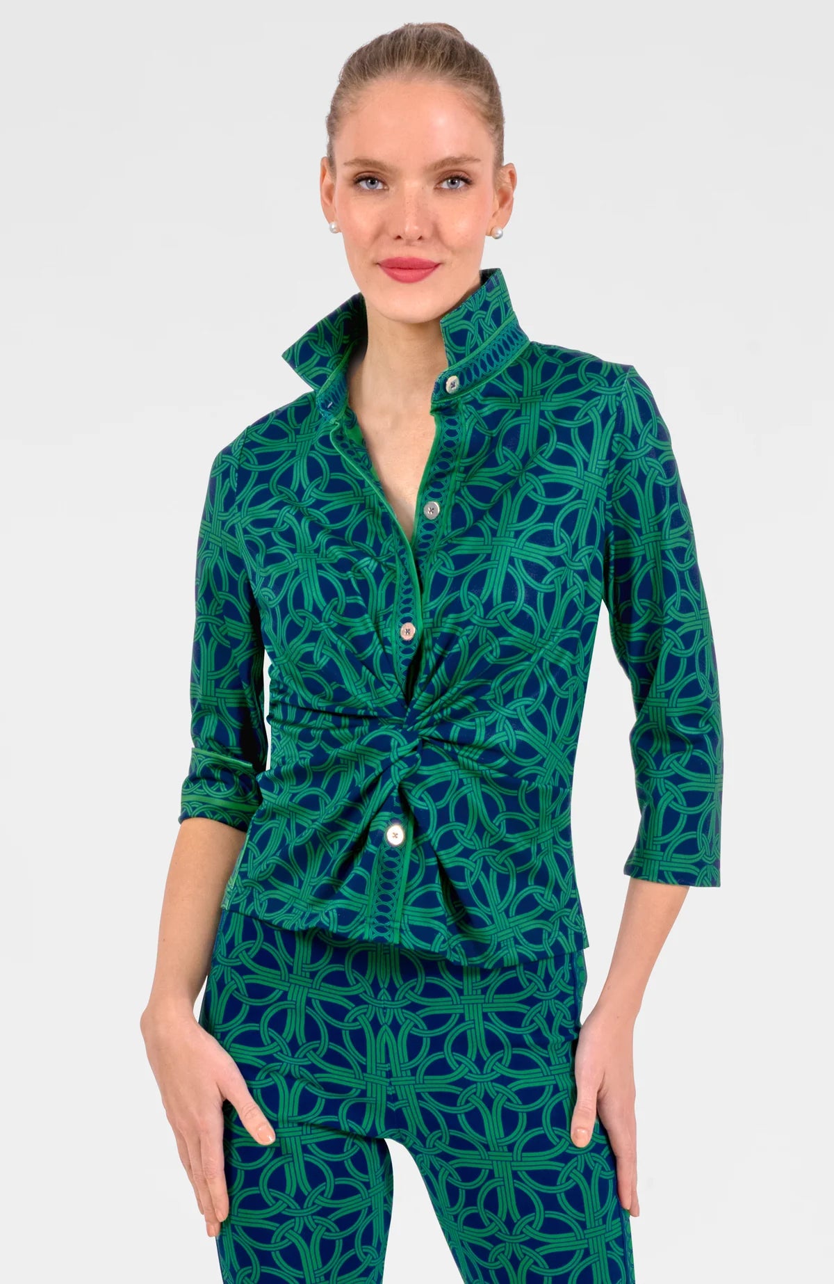 Discover the Twist & Shout Top, where playful ring toss patterns meet chic details. Its 3/4 sleeves with optional turn-back cuffs let you switch up your style effortlessly. Bright shiny gold buttons enhance its polished look, while the contrasting fabric inside the back panel, front facing, and neck placket adds refined depth. Perfectly designed to elevate your everyday wardrobe with a confident, stylish edge.